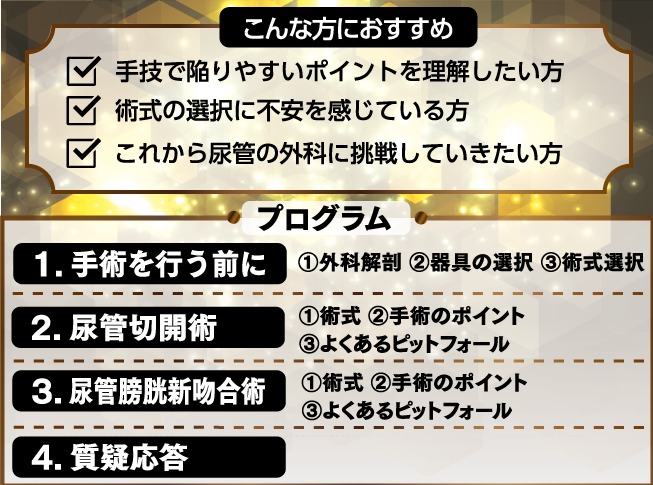 尿管の組織学的再建を一度学び直したい、これから尿管の外科に挑戦したい、患者さんへの説明に困っているので概要を知りたい方など、多くの方が学べる講義だと思います。